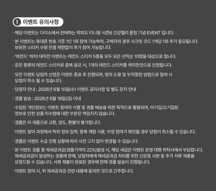 당첨자 리스트는 2026년 6월 10일 이벤트 홈페이지에 게시하고, 개별 문자 메시지로도 안내드릴 예정입니다.