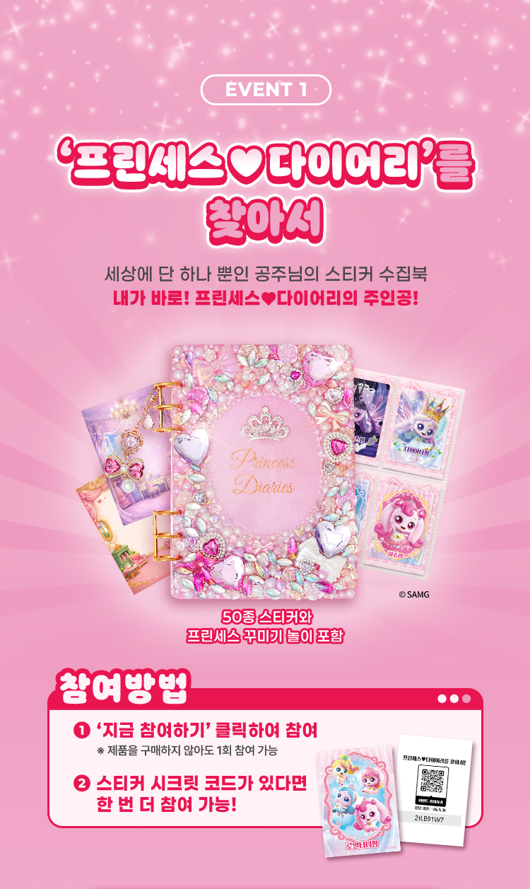 1인 1회 무료 참여 가능하며, 제품에 동봉된 티니핑 스티커 뒷면의 시크릿코드 입력 시 1회 추가 참여 가능합니다.